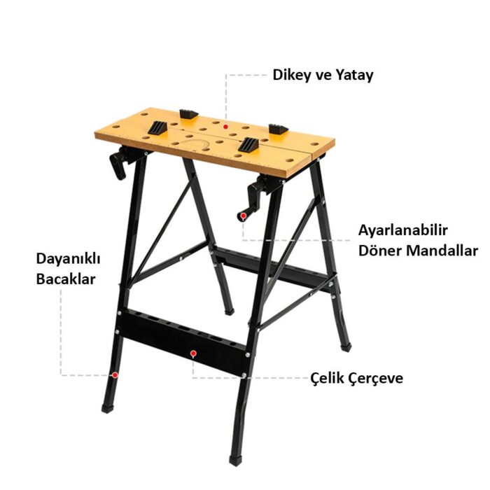 • Taşınabilir, katlanabilir, son derece hafif, sağlam MDF tabla ve çelik destekli yapısı ile 70kg’a kadar büyük ve geniş hacimli malzemelerin, masa, sandalye, keresteler, PVC ve Metal Parçaların çalışma tezgâhı üzerine sabitlenerek kesme, tamir etme, boyama gibi birçok tamirat ve tadilat işlemlerinin zorlanmadan yapılması için üretilmiş çok fonksiyonlu çalışma tezgâhıdır.
